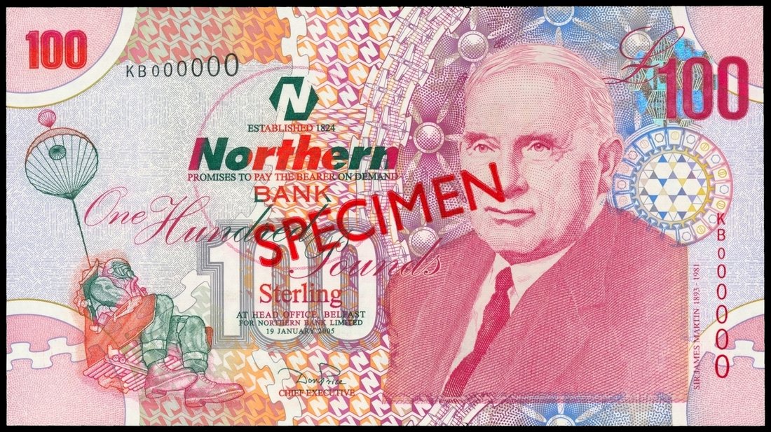 Northern Ireland, 100 pounds, specimen, 19.1.2005, serial number number KB000000, red and blue on multicolour underprint, Sir James Martin at right, reverse shows the Pediment of City Hall in Belfast at centre,