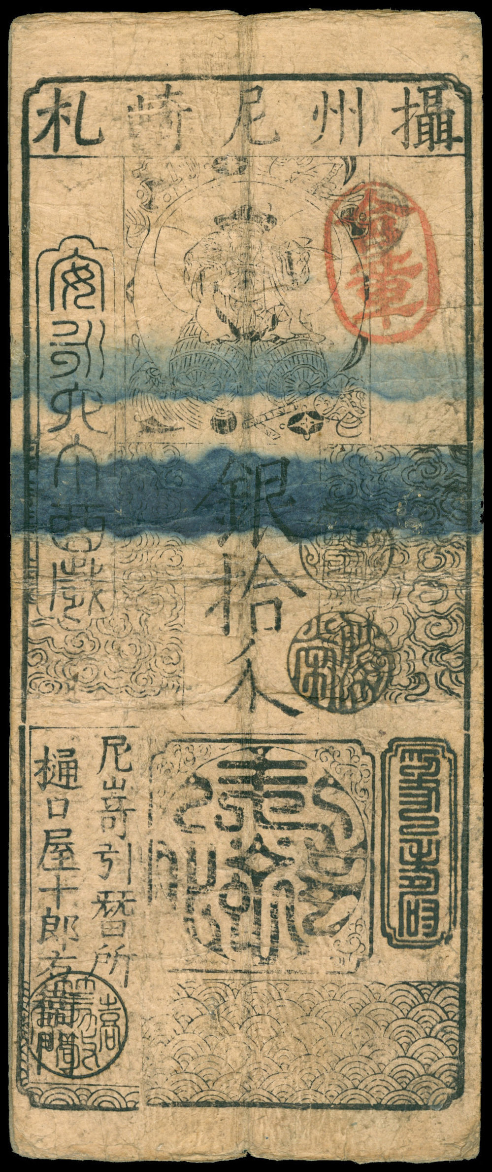 Japanese Provincial note, Amagasaki-han, 10 silver mom, ND(1777), mythical figure standing on twin barrels, denomination at centre, black seals,