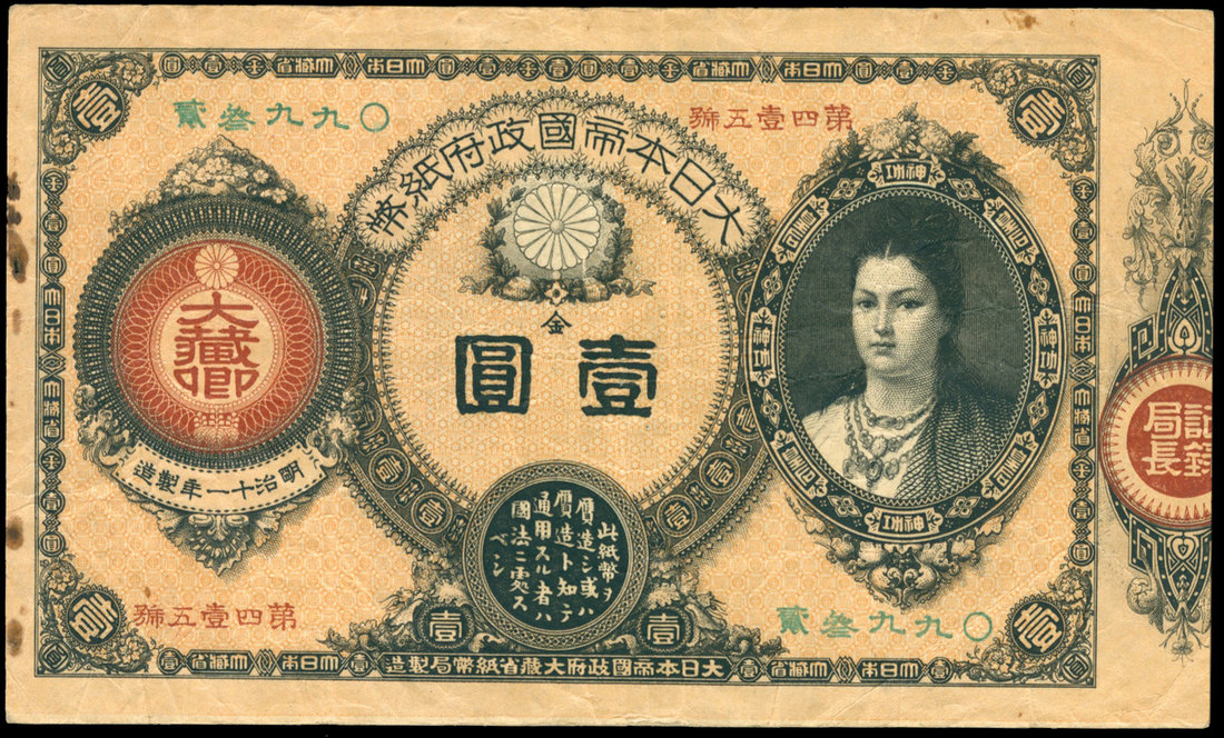 Japan, 1 yen, ND (1878), serial number 09932, brown underprint, portrait Empress Jingu at right, red seal on reverse,