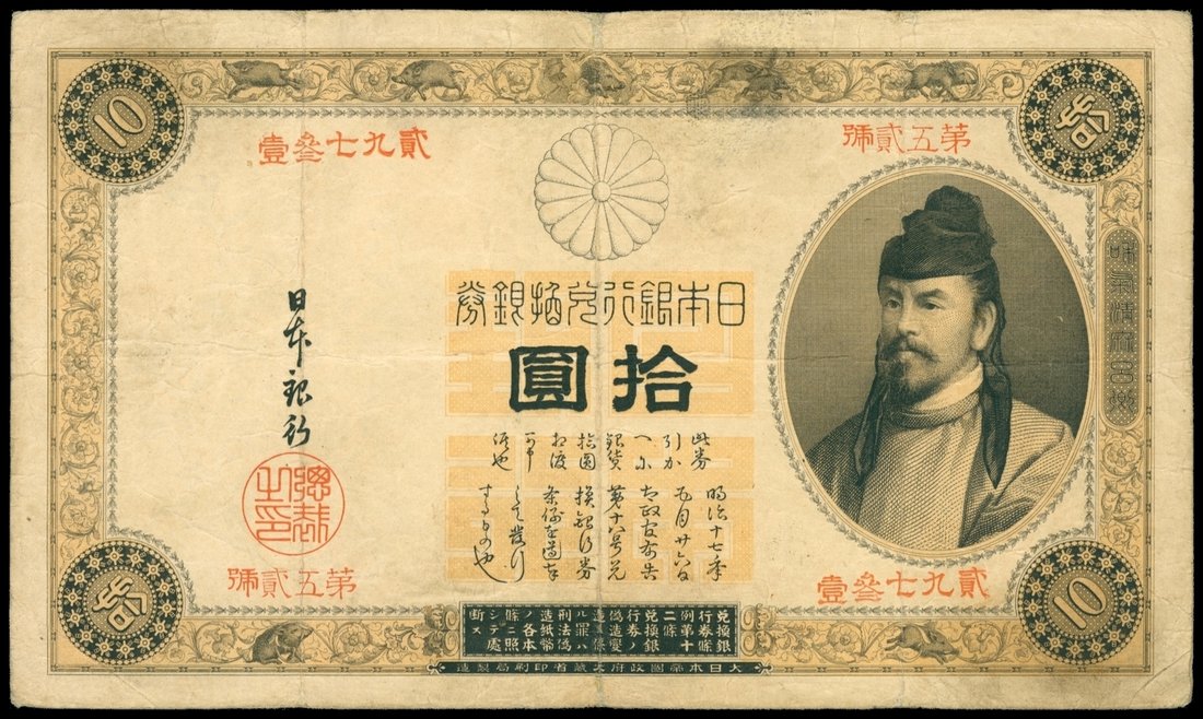 Japan, 10 yen, 1890, serial number 29731, black on light brown, underprint, Wakeno Kiyomaro at right, Japanese character serial number, reverse orange, Kanji and English text,