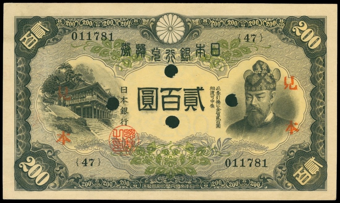 Japan, 200 yen, specimen, ND (1945), serial number 011781, block 47, black on gray and green underprint, Danzan Shrine at left, Fujiwara Kamatari at right, reverse blue, japanese text with denomination in English, hole punch cancelled, ‘Mi-hon’ (Specimen’) overprinted in red,