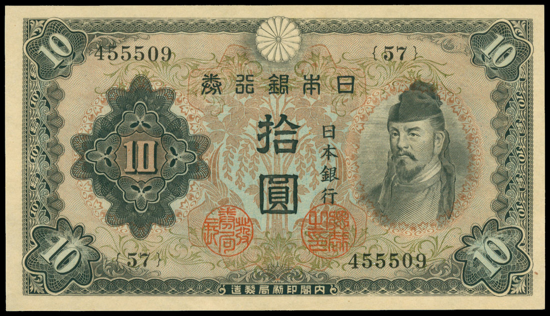Japan, 10 yen, ND (1943), serial number 455509, block 57, PICK PLATE NOTE, black on brown and light blue underprint, Wakeno Kiyomaro at right, black serial number and block number, japanese text only, reverse blue, Goo Shrine at centre,