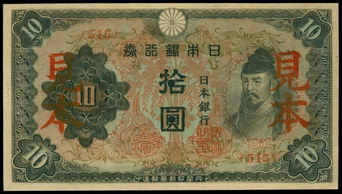Japan, 10 yen, specimen, ND (1944-45), block 515, black on brown and light blue underprint, Wakeno Kiyomaro at left, red block number, reverse blue, Goo Shrine at centre, hole punch cancelled, red Chinese characters ‘Mi-hon’ overprinted,