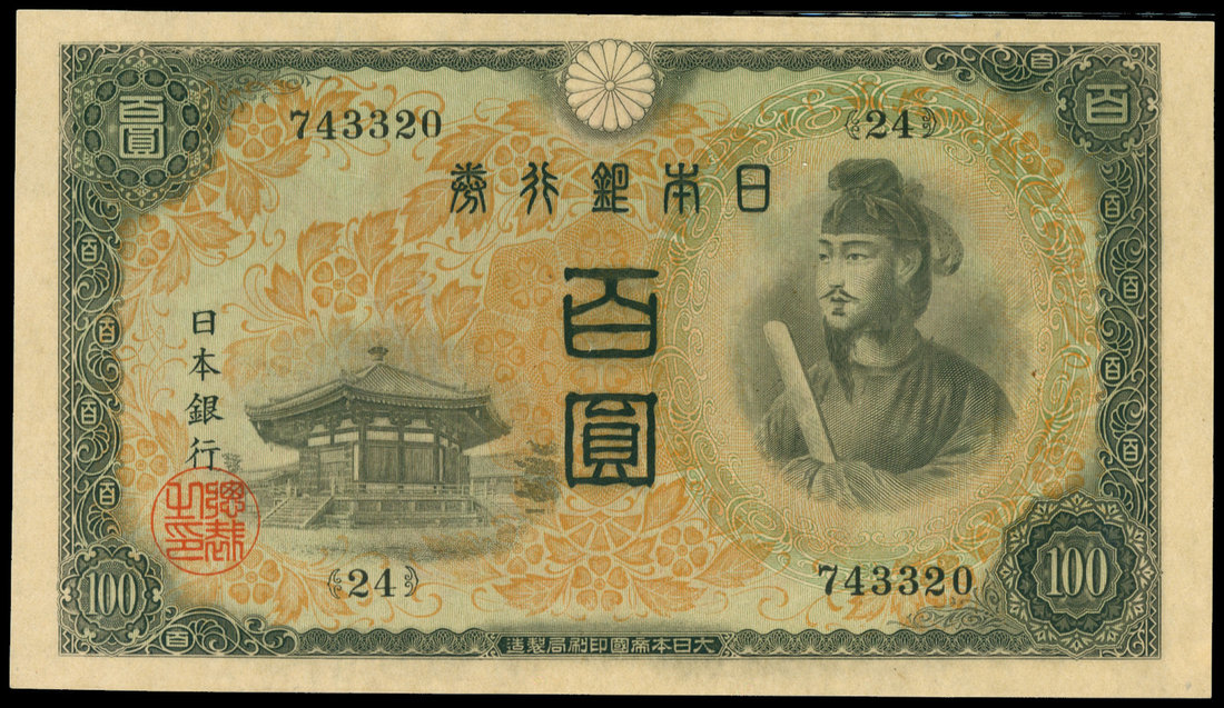 Japan, 100 yen, ND (1944), serial number 743320, block 24, PICK PLATE NOTE, black on brown underprint of leaves, Yumedono Pavilion at left, Shotoku-taishi at right, reverse lilac,