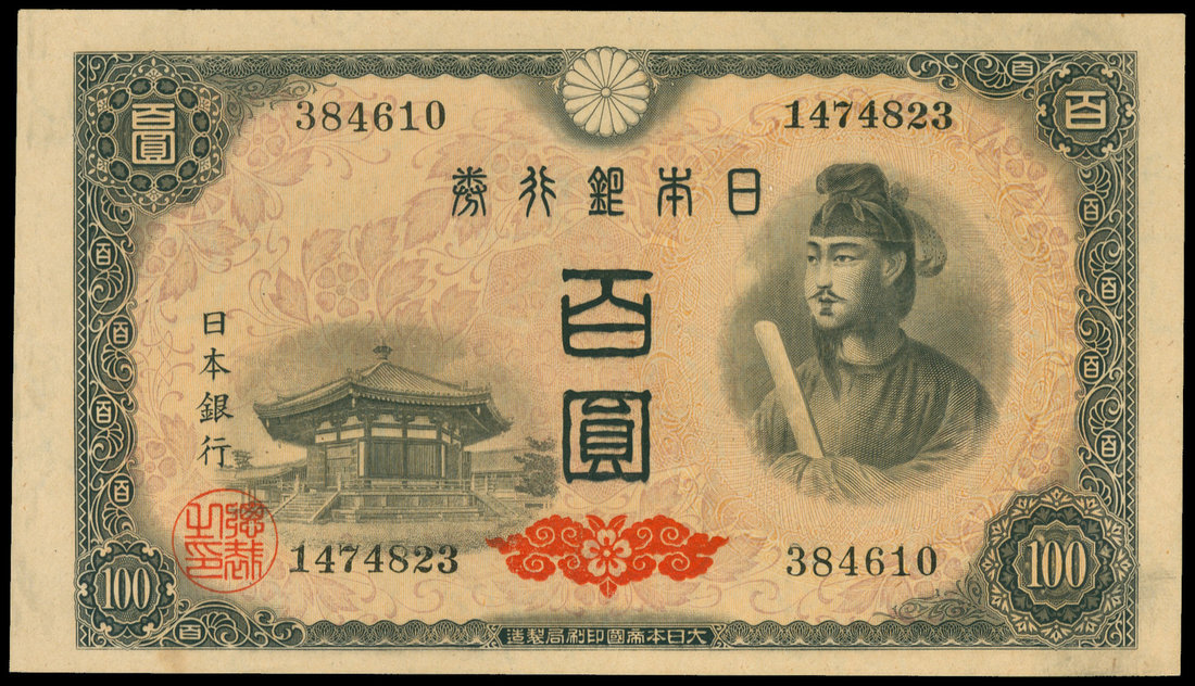 Japan, 100 yen, ND (1946), serial number 384610 / 1474823, black on lilac underprint of leaves, Yumedono Pavillion at left, Shotoku-taishi at right, black serial number, reverse blue, watermark of kiri leaves,