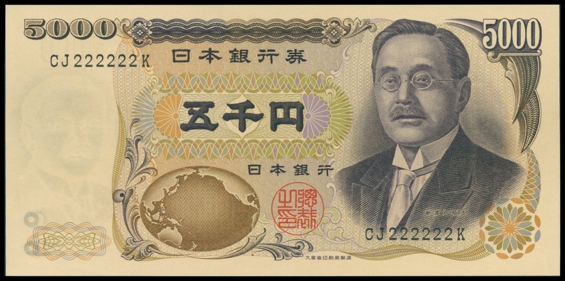 Japan, 5000 yen, ND (1984-93), serial number CJ222222K, purple on multicolour underprint, Inazo Nitobe at right, watermark at left, Mt. Fuji at centre on reverse,