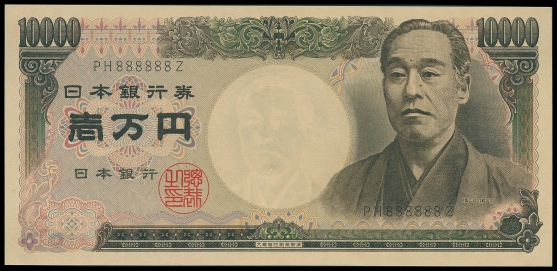 Japan, 10000 Yen, ND (1984-93), serial number PH888888Z, light brown on multicolour underprint, Yukichi Fukuzawa at right, watermark at centre,