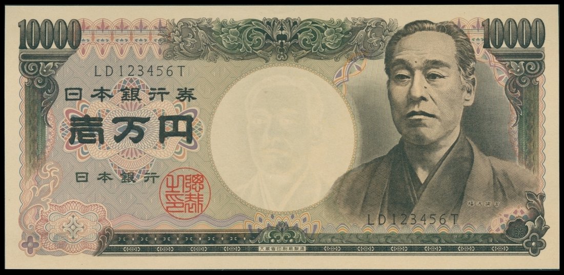 Japan, 10000 Yen, ND (1984-93), serial number LD 123456T, brown on multicolour underprint, Yukichi Fukuzawa at right, watermark at centre,