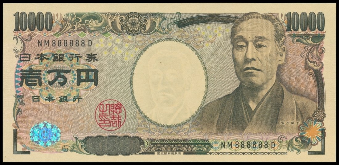 Japan, 10000 yen, ND (2004), serial number NM888888D, brown on multicolour underprint, Yukichi Fukuzawa at right, watermark at centre,