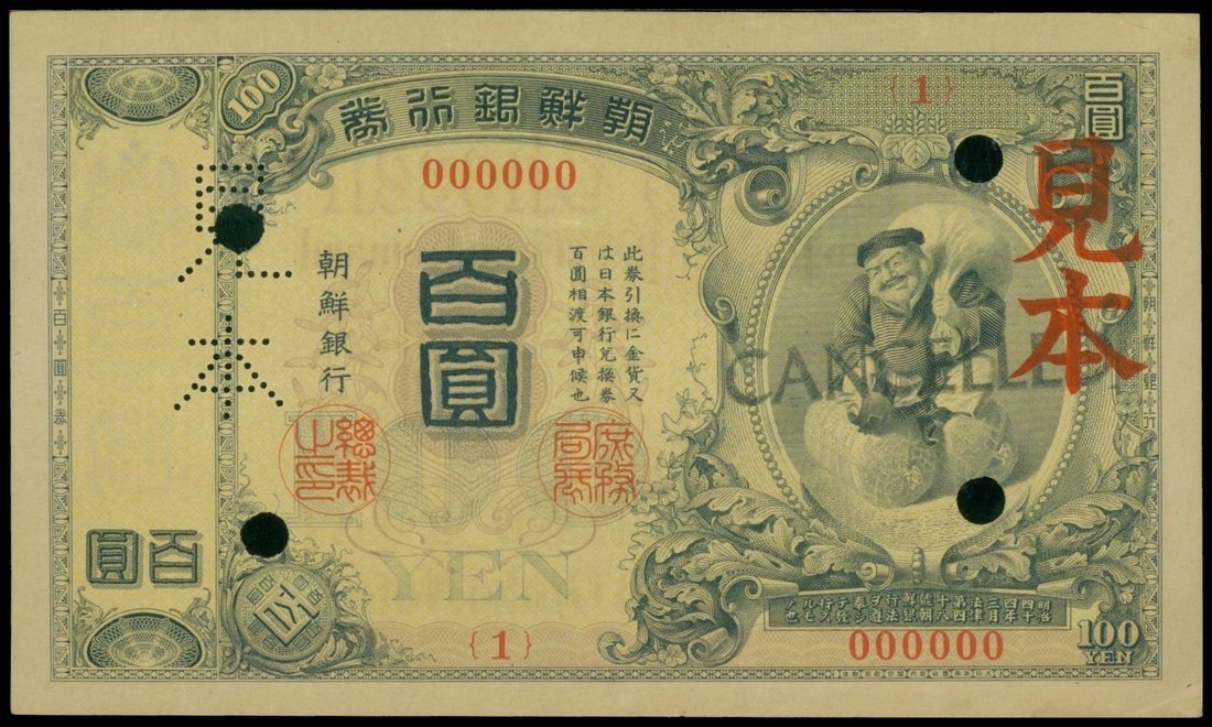 Bank of Chosen, Korea, Specimen 100 Yen, 1911, red serial 000000, blue and pale yellow, the God of Fortune carrying a sack at right, reverse brown and pale yellow-brown, value and bank title, hole punch cancelled and overprinted 'SPECIMEN' in English and Kanji,