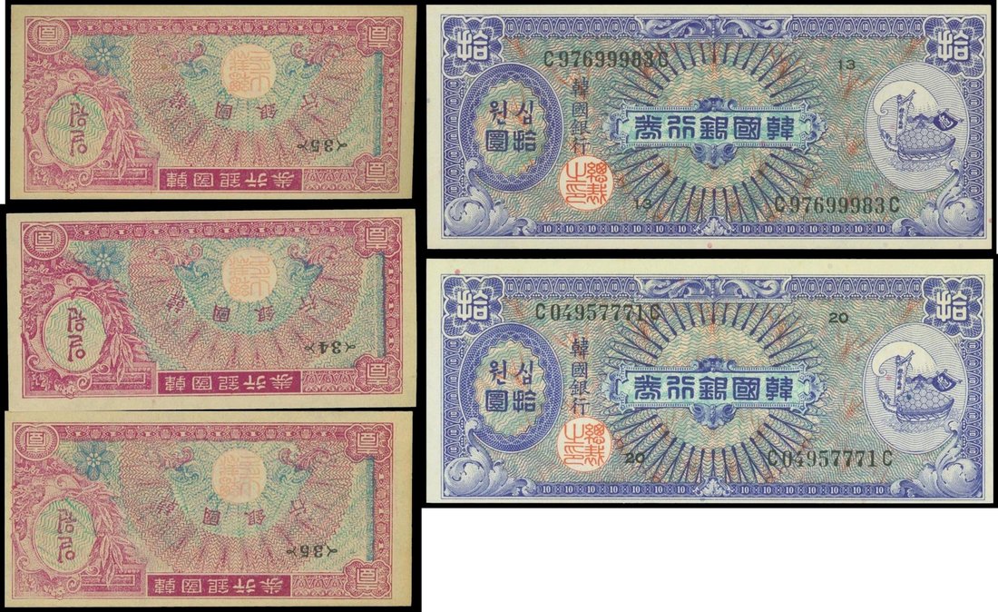 Bank of Korea, a lot of 5 notes, 1won (3) and 10 won (2), 1953, purple pn green and blue on green respectively,
