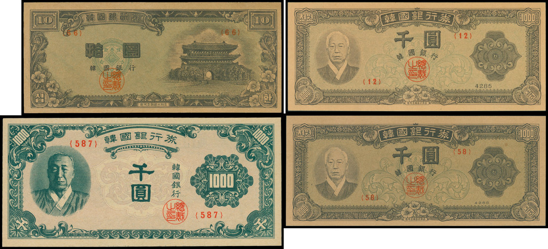 Bank of Korea, a lot of 4 notes, 1000 won, 1950, 1952 and 1953, the latter two notes feature Syngman Rhee at right, also 10 Hwan, 1953,
