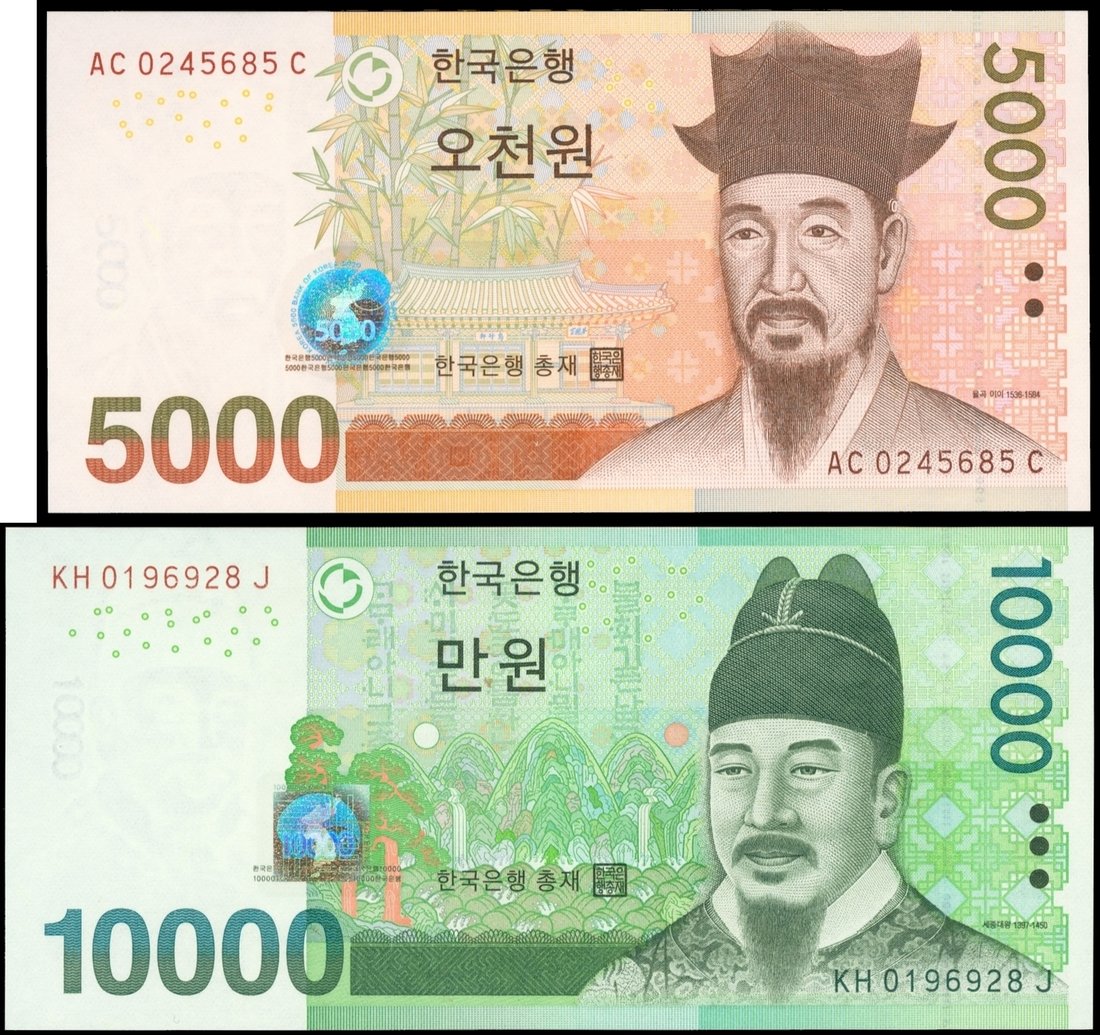 Bank of Korea, a pair of 'Pick Plate notes', 5000 and 10000 won, ND(2006-2007), red serial AC0245685C and KH0196928J, orange and green respectively, confucian scholar Yulgok Yi I Ojukheona at right or King Sejong the Great at right,