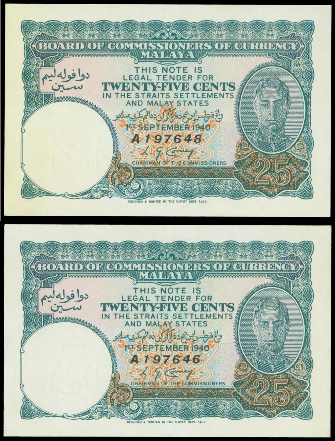 Malaya, pair of 25 cents, 1.9.1940, serial number A197646 and A 197648, aqua on lilac and orange underprint, King George VI at right, watermark at left, reverse shows arms of 11 states,