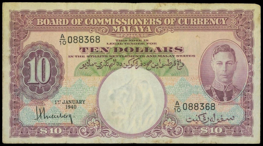 Malaya, $10, 1.1.1940, serial number A/10 088368, violet on green underprint, King George VI at right, reverse shows arms of the 11 states,