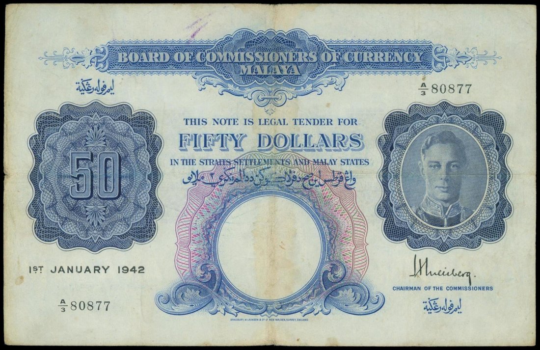 Malaya, $50, 1.1.1942, serial number A/3 80877, blue, King George VI at right, watermark at bottom centre, reverse shows arms of states,