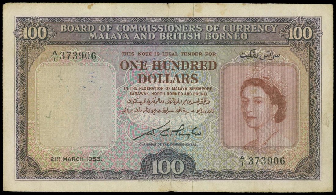 Malaya and British Borneo, $100, 21.3.1953, serial number A/1 373906, violet and brown, Queen Elizabeth II at right, watermark at left,