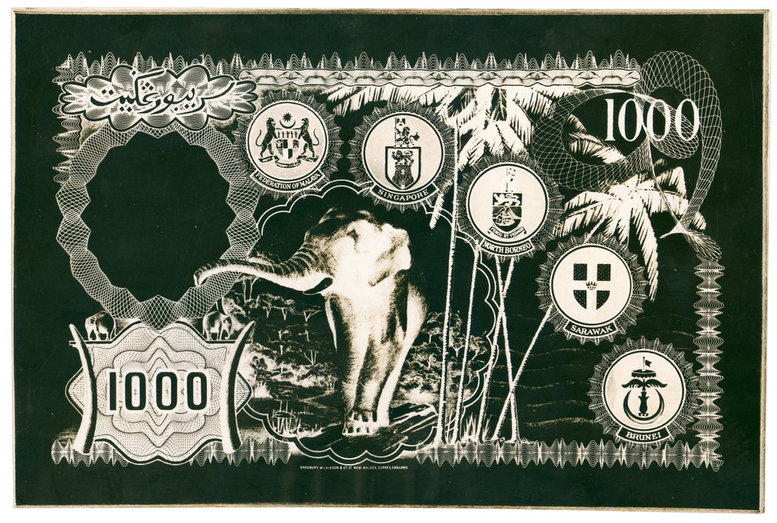 Malaya and British Borneo, a black and white film showing an unissued design for $1000, ?1950's, elephant at centre, with arms of Malaya, Singapore, Sarawak, North Borneo and Brunei,