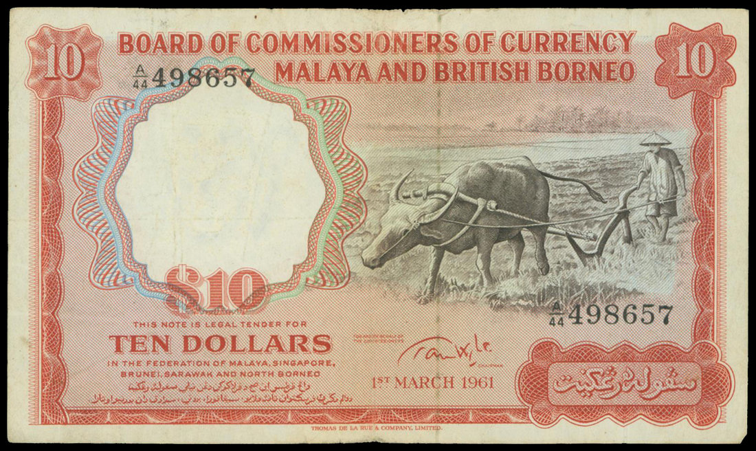 Malaya and British Borneo, $10, 1.3.1961, serial number A/44 498657, red and dark brown on multicolour underprint, farmer plowing with ox at right, watermark of tiger's head at left,