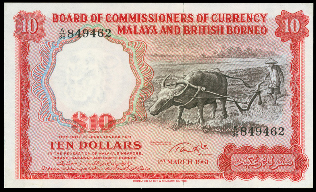 Malaya and British Borneo, $10, 1.3.1961, serial number A/35 849462, red and black on multicolour underprint, farmer ploughing with water buffalo at right, watermark of tiger at left, reverse red,