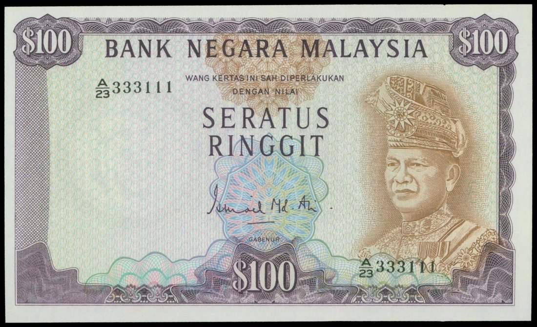 Malaysia, 100 ringgit, 1972-76, semi lucky serial number A/23 333111, purple and brown on multicolour underprint, T.A. Rahman at right, value at top left and right, bottom centre, reverse purple, state emblem at centre,