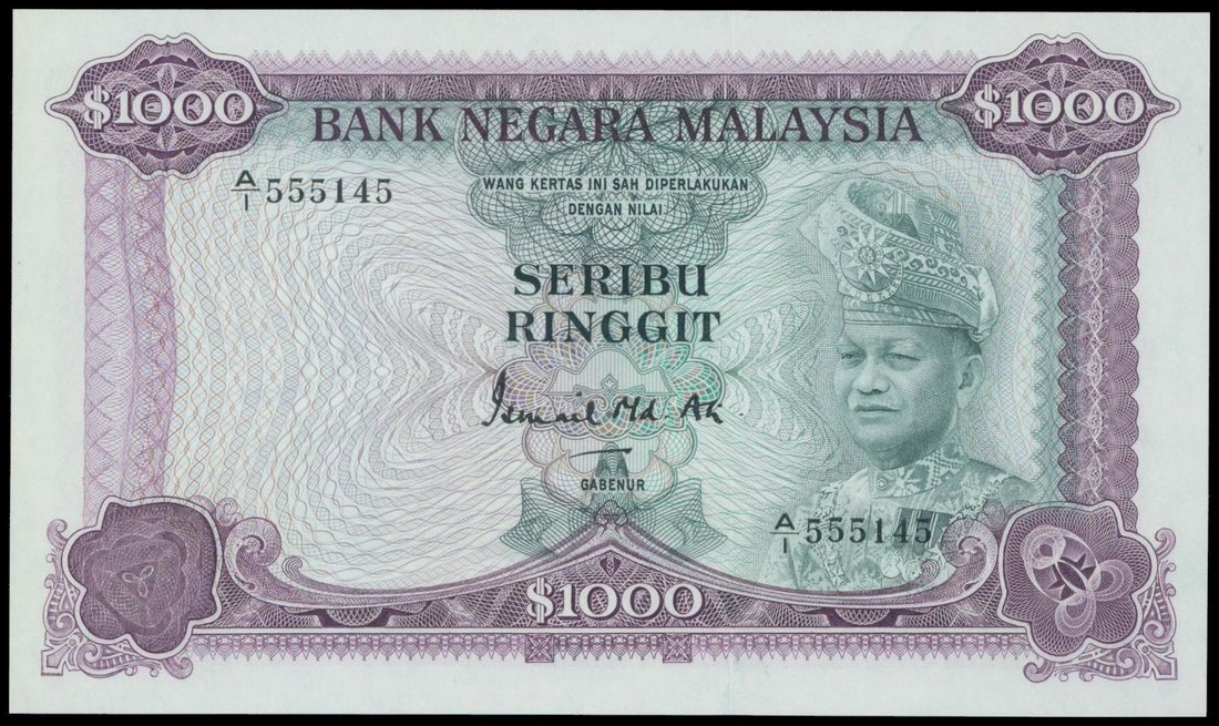 Malaysia, Bank Negara Malaysia, 1000 ringgit, no date (1972-1976), serial number A/1 555145, purple and greenish-grey, Rahman at right, the reverse purple and multicolour, Parliament building at centre, signed by Ismail Md. Ali,