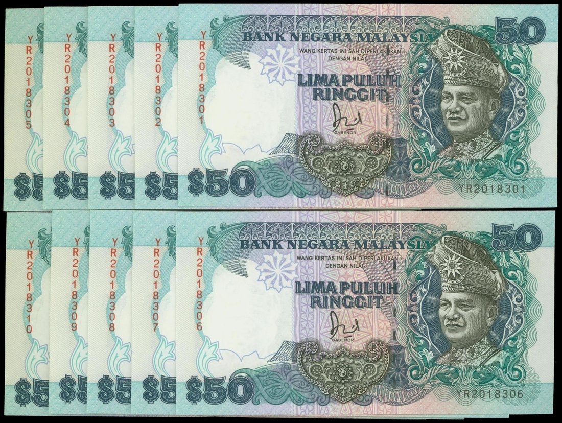 Malaysia, consecutive set of 10x $50, ND (1983-84), serial number YR 2018301 to YR 2018310, black and blue-gray on multicolour underprint, T.A. Rahman at right, watermark at left, reverse shows the National Museum at Kuala Lumpur, signed by Jafar Hussein,