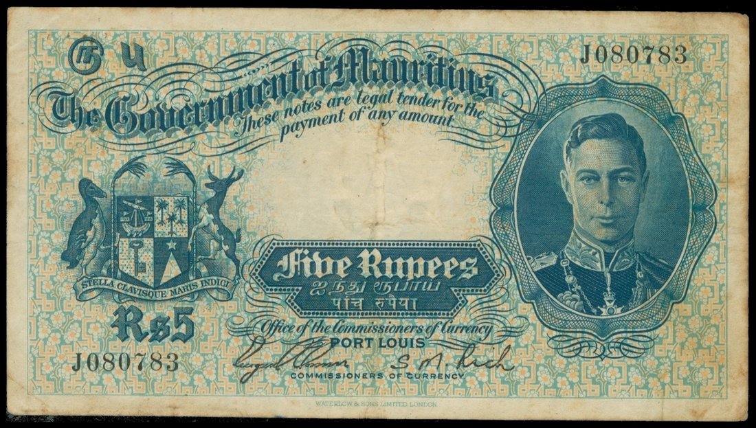 Government of Maurititus, 5 rupees, ND(1937), black serial J080783, blue and multicoloured, George VI at right, sailing ship watermark at centre,