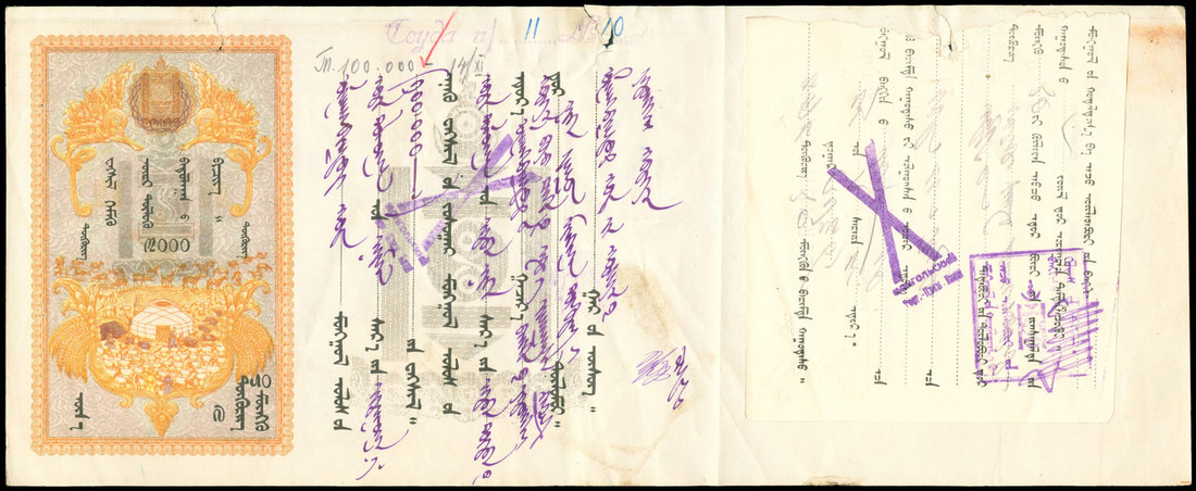 Mongolia, Commercial and Industrial Bank, promissory note/exchange bill for 3000 tugrik, c.1925, large format with note at left, details of sender at right, grey, tan and brown, ger at centre, surrounded by people, goats and horses, an extra closure in attached to the far right,