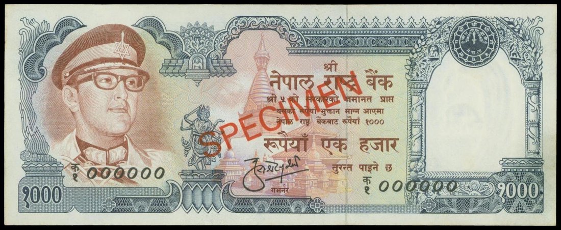 Nepal, 1000 rupees, SPECIMEN, ND (1974), blue on multicolour underprint, King Birendra Bir Bikram at left, temple and Great Stupa at centre, elephant at centre on reverse,