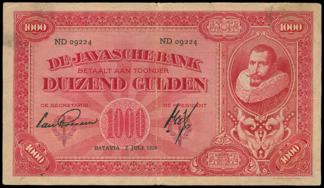 De Javasche Bank, 1000 gulden, 1926, serial number ND 09224, red, portrait of Jan Pieterzoon Coen at top right, reverse brown and pink, building at centre, text in four languages at four corners,