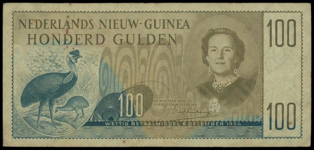 Netherlands New Guinea, 100 gulden, 8.12.1954, serial number MD 014140, light and dark olive brown and dark blue, Queen Juliana at right, sicklebill at left, owl on reverse,