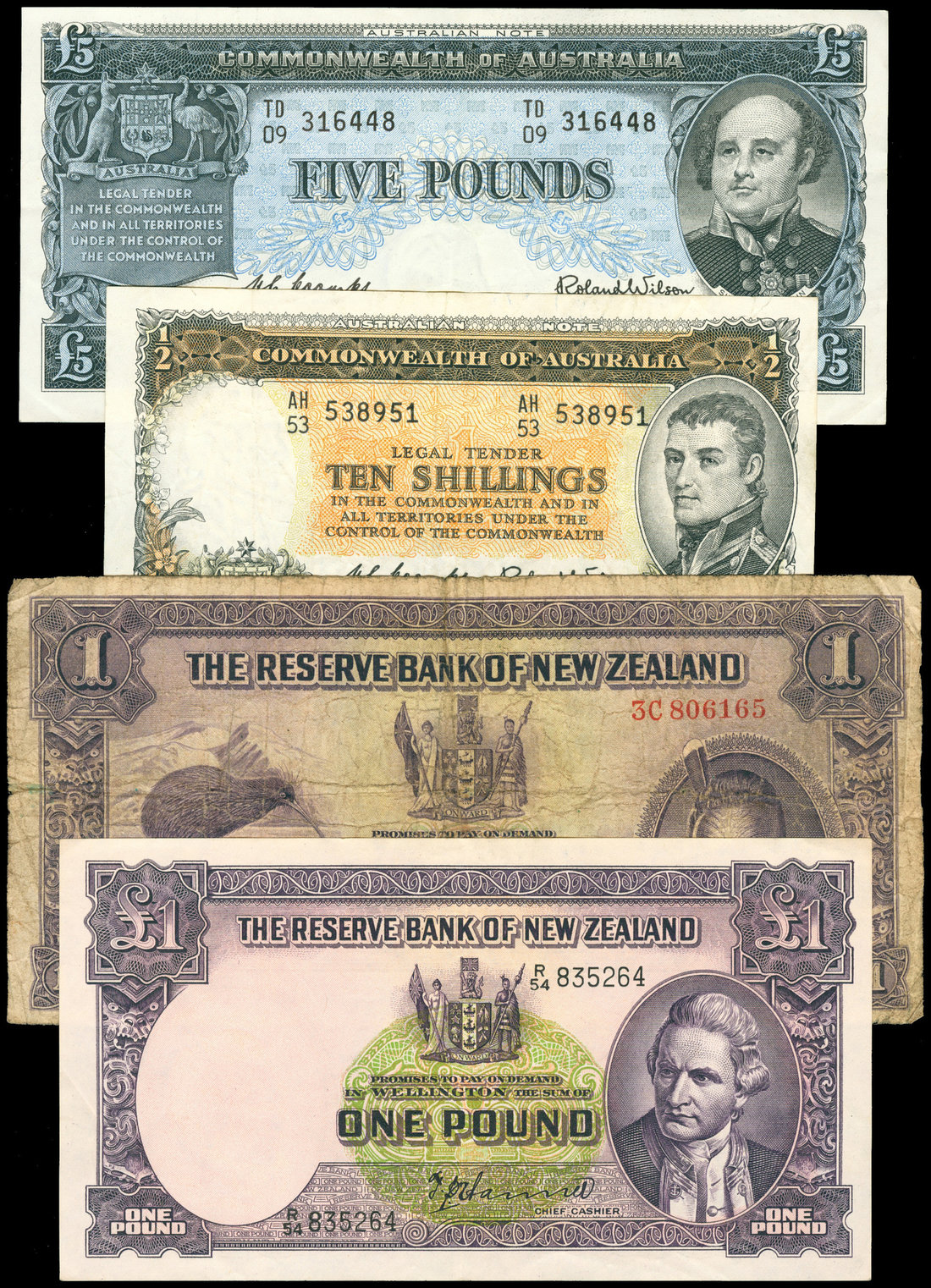 Mixed lot, group of 4 notes from Commonwealth of Australia and the Reserve Bank of New Zealand, 10 shillings, 1 pound (2) and 5 pounds,