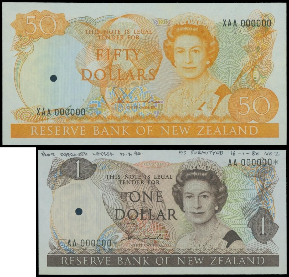 New Zealand, pair of $1 and $50, ND (1981-82) and ND (1983-92), 'SPECIMEN PROOF', serial number AA 000000, for $1, central design fluoresce orange, security striop blue, back left and value 1 orange, dark brown on multicolour underprint mature portrait of Queen Elizabeth II, pied fantail at centre and plants on reverse, for $50,, yellow-orange on multicolour underprint, Queen Elizabeth II ar right, morepork owl at centre and plants on reverse,