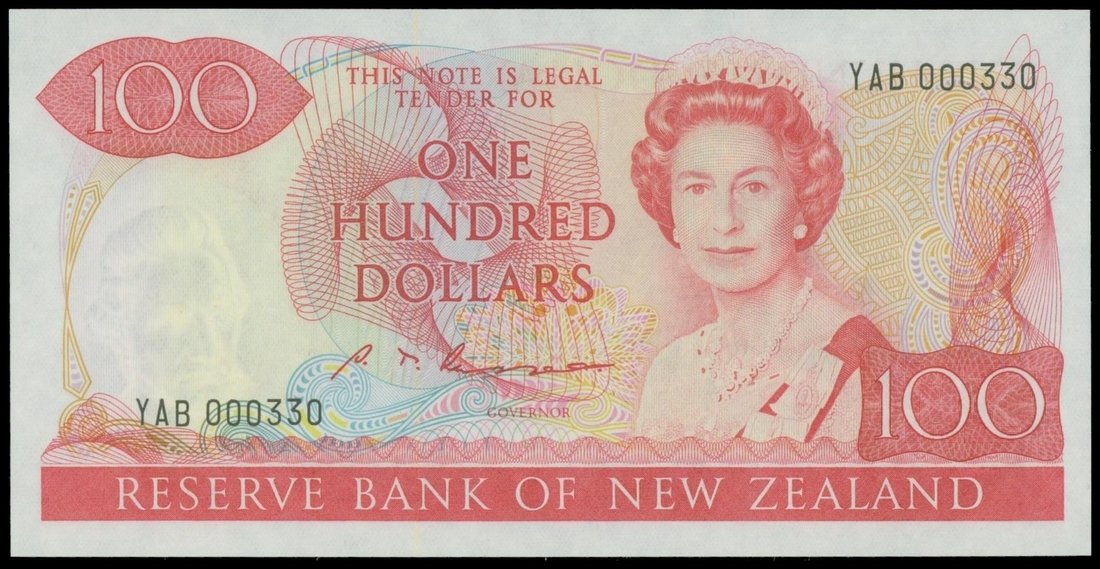 New Zealand, $100, ND (1985-89), first prefix low serial number YAB000330, red on multicolour underprint, Elizabeth II at right, watermark of at left, reverse red and multicolour underprint, eagle at centre,