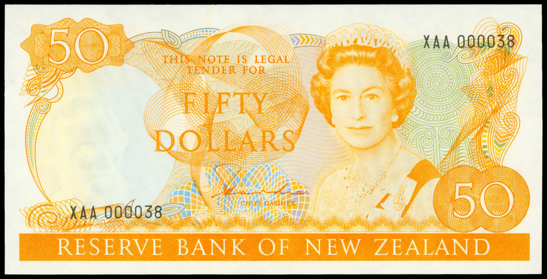 New Zealand, $50, 1981-1985, low serial number XAA 000038, orange on multicolour, The Queen at right, watermark of Captain Cook at left, morepork on reverse, signed by H.R. Hardie,