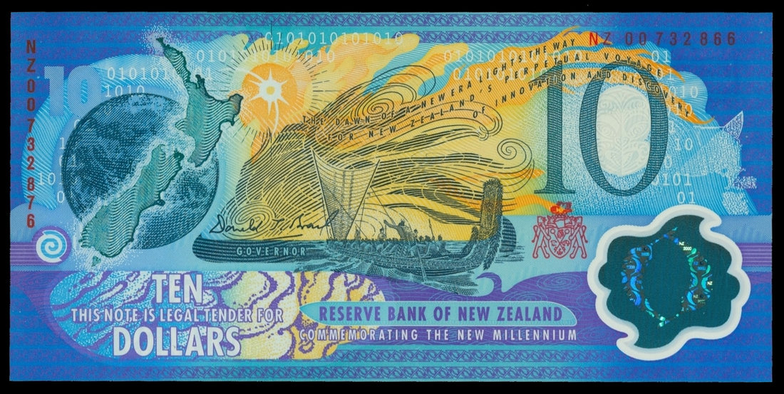 Reserve Bank of New Zeland, $10, ND (2000), millennium commemorative, ERROR NOTE, MISMATCHED SERIAL NUMBERS, NZ 00732866 and NZ 00732876, polymer plastic, blue, orange and multicolour, earth, map of New Zealand at left, ceremonial boat at centre, reverse shows five sports activities,