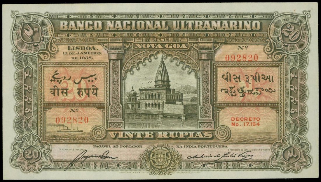 Portuguese India, 20 rupias, 11.1.1938, serial number 092820, olive-brown on peach underprint, palace at centre, date at upper left, reverse shows a tiger,