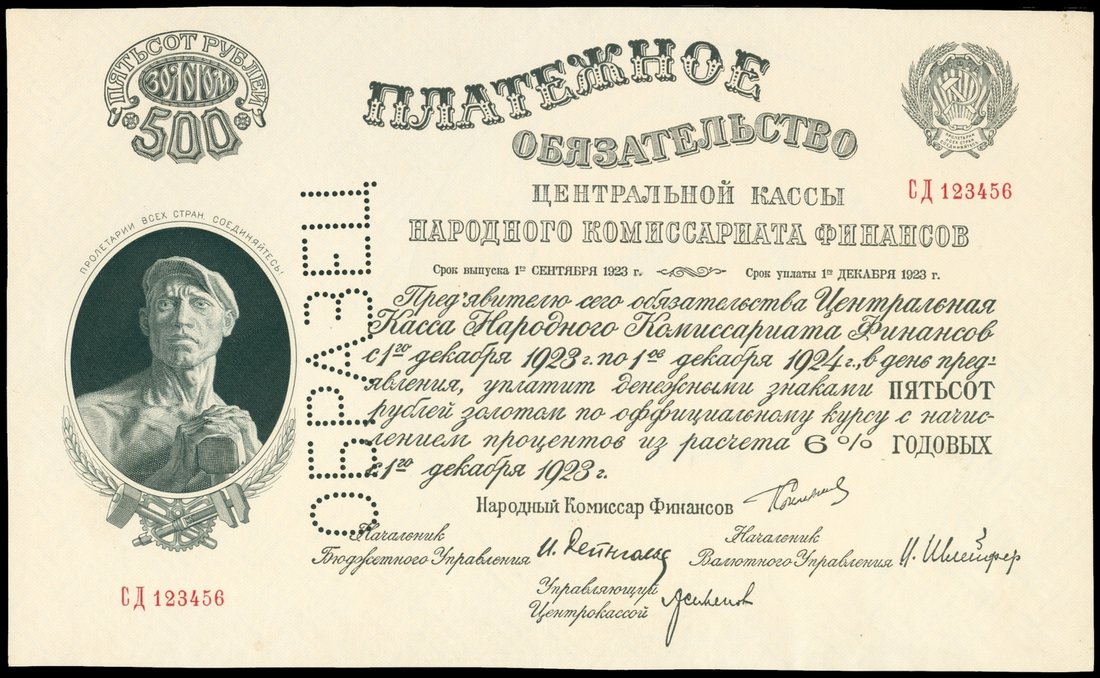Russia, N.K.F. Payment Obligations of the R.S.F.S.R, 500 Gold Roubles, specimen, 1923, serial number 123456, black on white, a Soviet worker at left, black manuscript text and signatures, perforated 'SPECIMEN' in Russian, uniface,