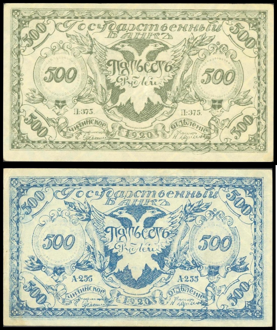 Government of the Russian Eastern Border Regions, Government bank, 2 x 500 rubles, 1920, blue and green respectively, arms of double-headed eagle at centre,