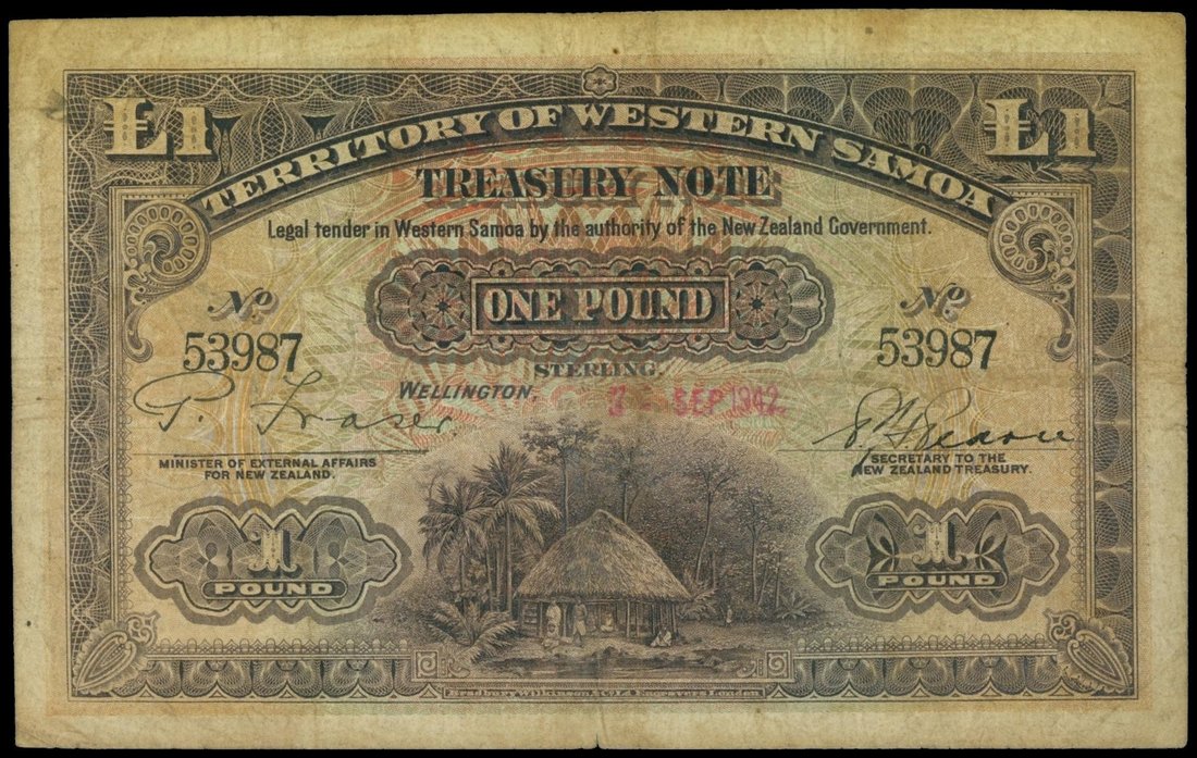 Territory of Western Samoa, 1 pound, 1942, serial number 53987, purple on multicolour underprint, hut, plam trees at centre, STERLING directly appears close beneath spelled out denomination at centre, signature varieties,