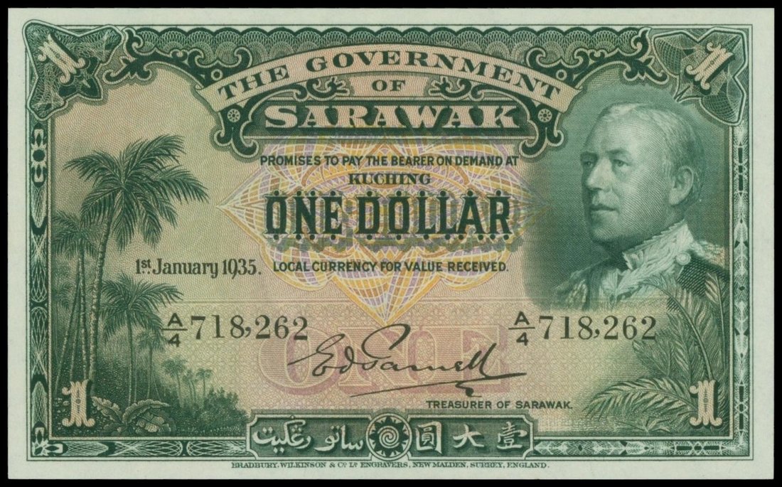 Sarawak, $1, 1.1.1935, serial number A/4 718262, green and multicolour, palm trees at left, C.Vyner Brooke at right, '1' at each corner, reverse green, arms at centre,