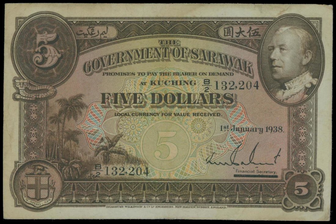 Sarawak, $5, 1.1.1938, serial number B/2 132204, brown on multicolour, C. Vyner Brooke at top right, arms lower left, bank title and denomination on reverse,