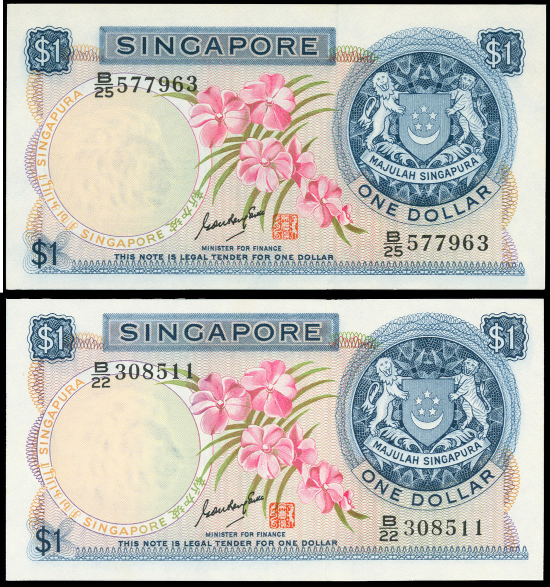Singapore, pair of $1, ND (1970), serial numbers B/22 308511 and B/25 577963, blue on multicolour underprint, light red flowers at centre, arms at right, watermark area legend fluoresce yellow, apartment buildings on reserve, both signed by Goh Keng Swee,