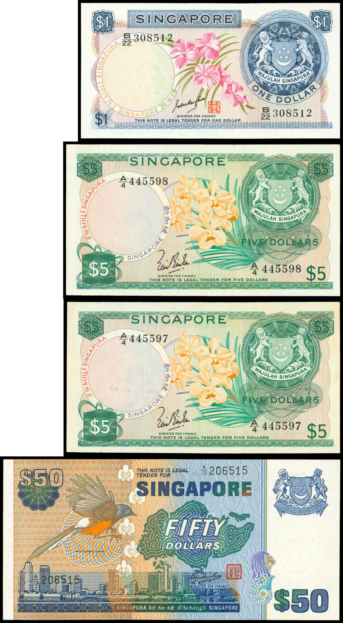Singapore, set of 4 notes, 1967-76, the 'Orchid' series, $1, consecutive pair of $5, serial number A/4 445597-98 and $50,