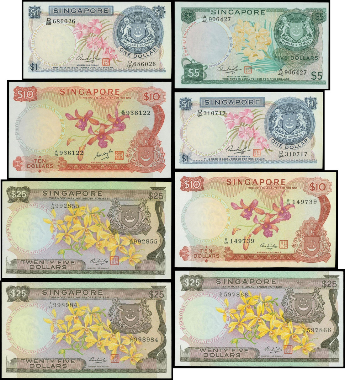 Singpore, set of 8 notes, 1970's, $1 (2), $5, $10 (2) and $25 (3), from the beautifule Orchid series, all notes signed by Hon Sui Sen apart from the $10 which is signed by Goh Keng Swee,