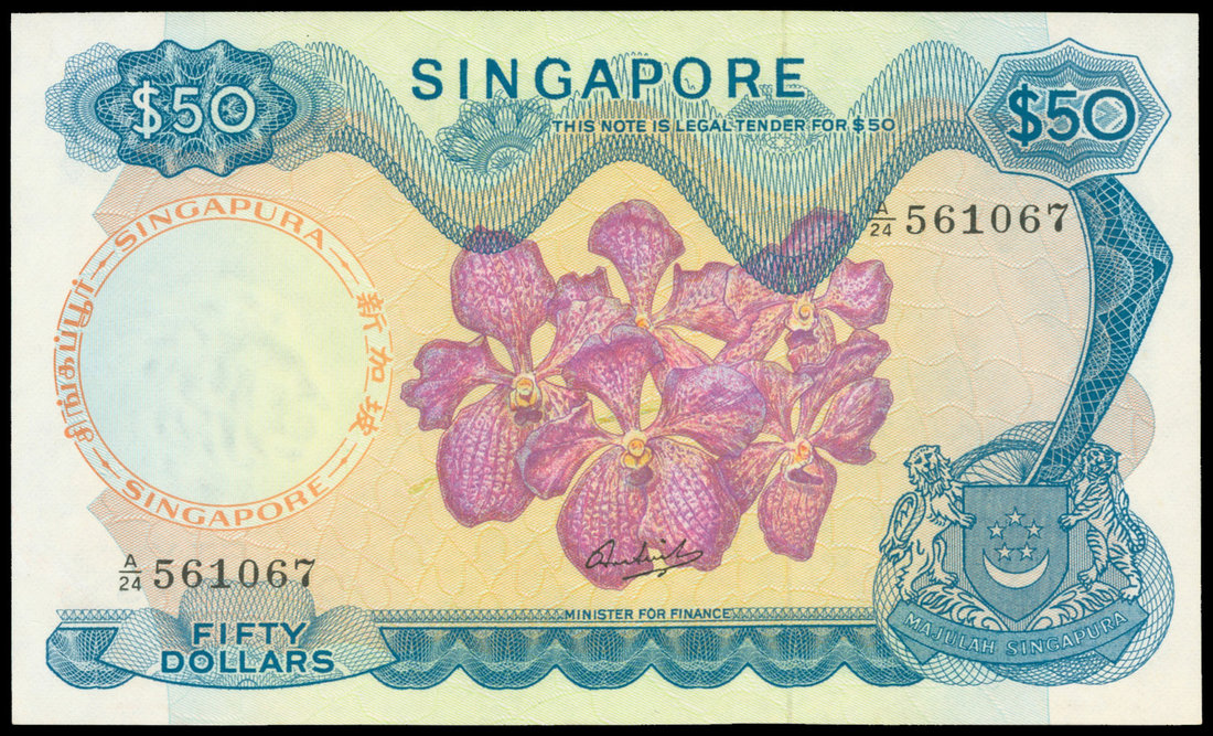 Singapore, $50, ND (1972), serial number A/24 561067, blue on multicolour underprint, violet flowers ar centre, arms at lower right, watermark of lion's head at left,
