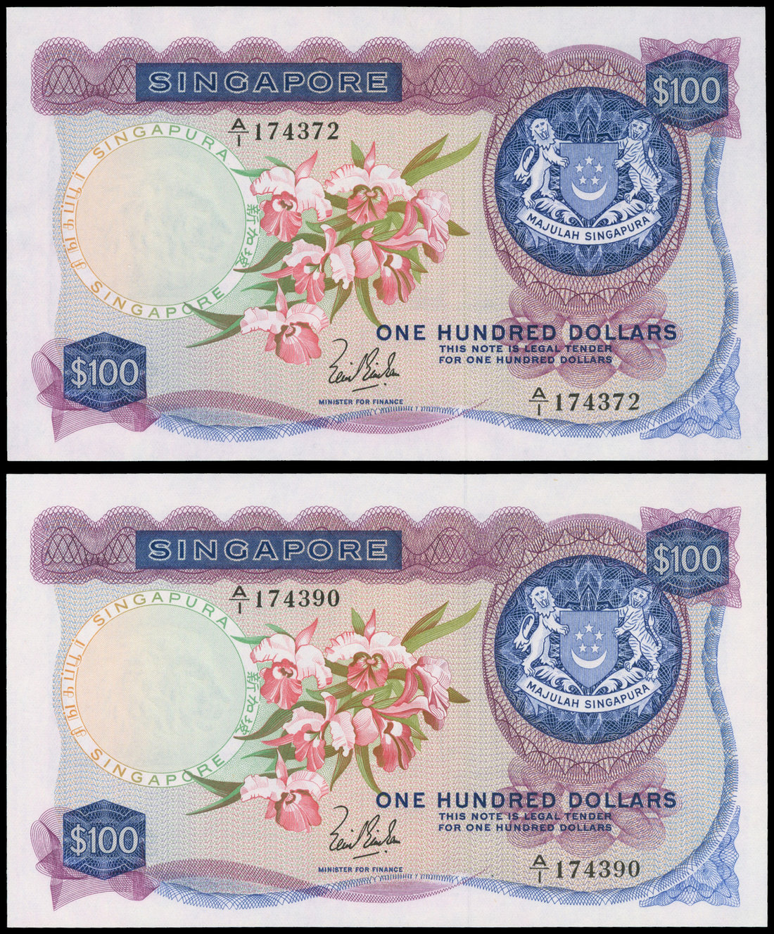 Singapore, pair of $100, ND (1967), serial number A/1 174372 and 174390, blue and purple on multicolour underprint, red flowers at centre, arms at right, reverse shows sailing vessels along Singapore waterfront, without red seal,