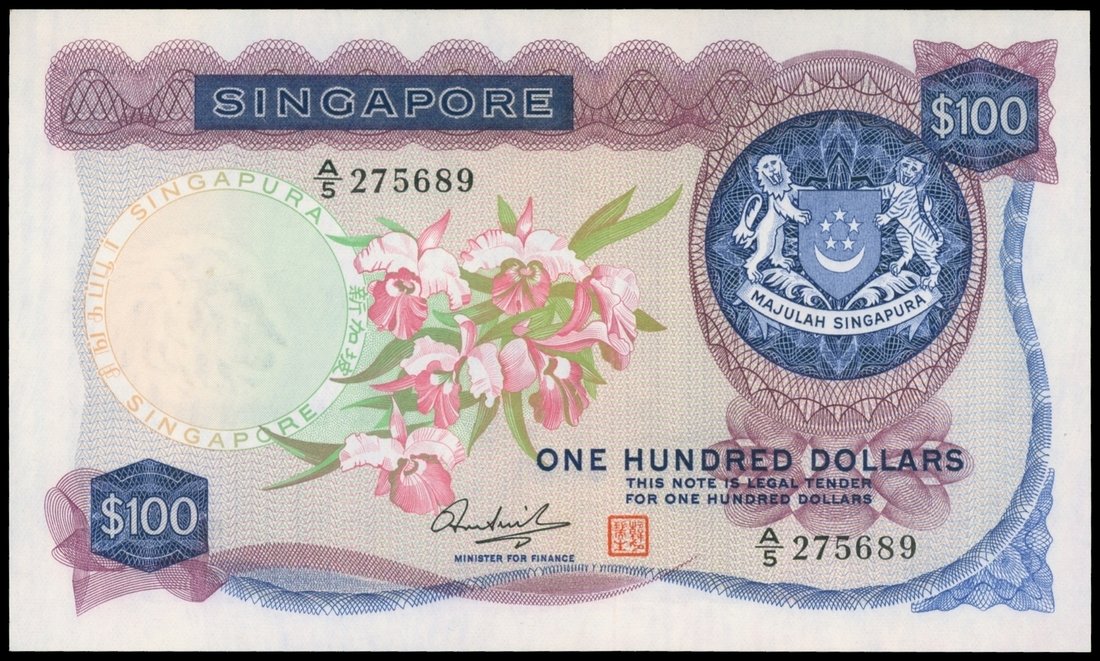 Singapore, $100, ND (1973), serial number A/5 275689, PICK PLATE NOTE, blue and violet on multicolour underprint, red flower at centre, arms at right, red signature and seal at centre,