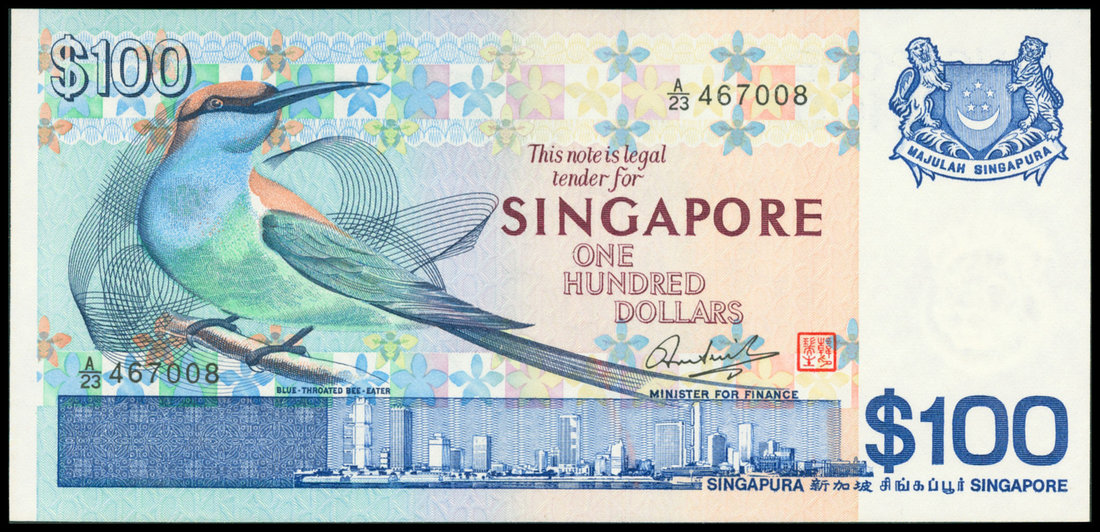 Singapore, $100, 1977, serial number A/23 467008, the 'Bird' series, blue and multicolour, blue throat bee eater at left,